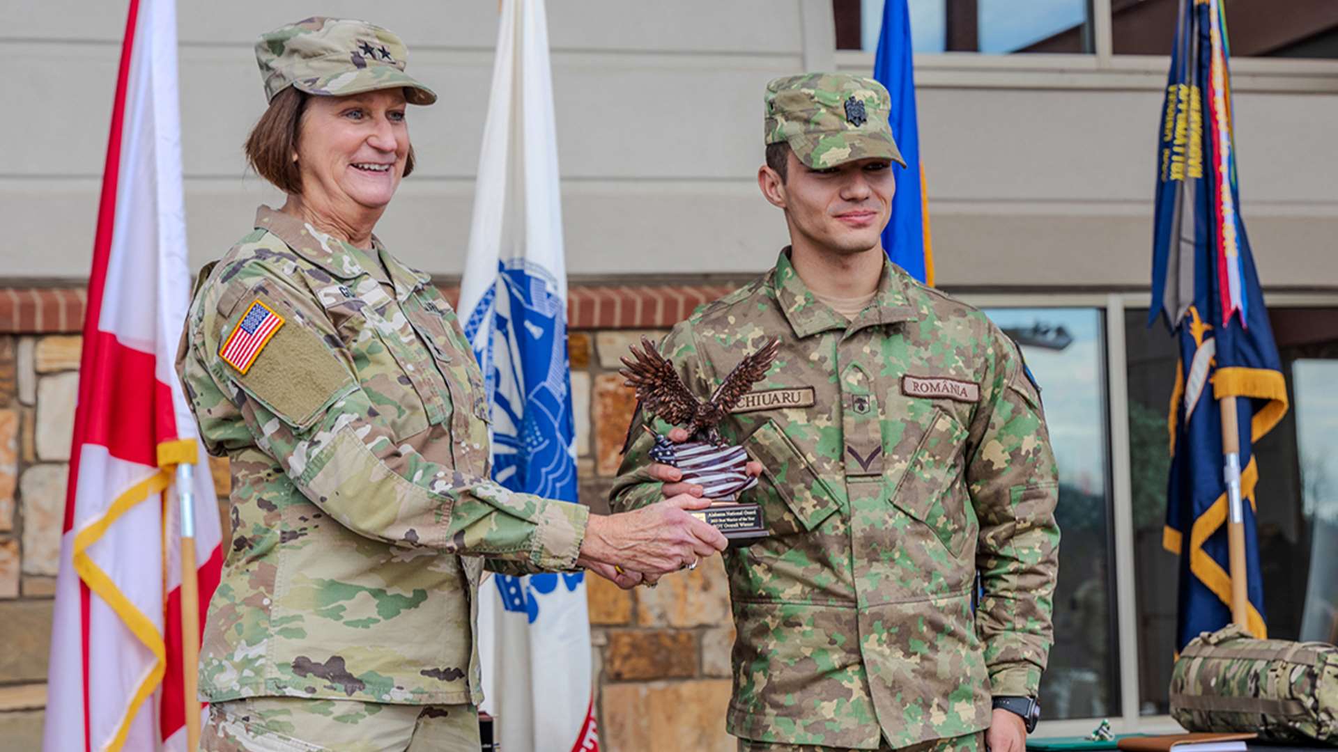 Alabama Army National Guard leadership present included the Adjutant General of Alabama, Maj. Gen. Sheryl Gordon, and Command Sgt. Maj. Elmore. Additionally, the Alabama Partnership for Peace counterpart country, Romania, was at the event. Representing Romania were the Romanian Senior Enlisted Advisor to the Chief of Defense for Romania, Command Sgt. Maj. Flores (SAS) and the Romanian Senior Enlisted Advisor to the Romanian Land Forces Commander, Command Sgt. Maj. Gheorge.