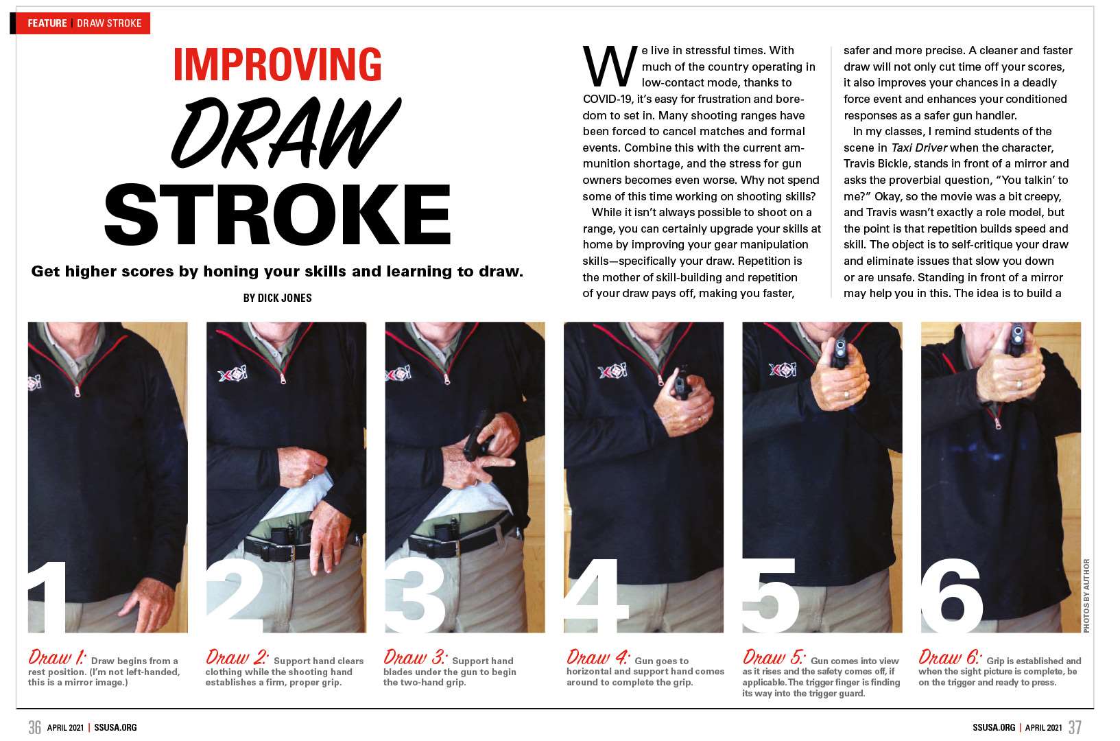 With the current ammunition shortage, it isn’t always possible to shoot live-fire on a range. But you can still improve your pistol skills at home by working on your gear manipulation skills—specifically your draw. In his article “Improving Draw Stroke,” author Dick Jones outlines six steps to follow at home that will improve your pistol draw by observing your reflection in a mirror. Adding a clean, fast pistol draw to your repertoire will increase your action shooting scores, as well as force you to become a safer gun handler. Read what Jones has to say about improving pistol draw.