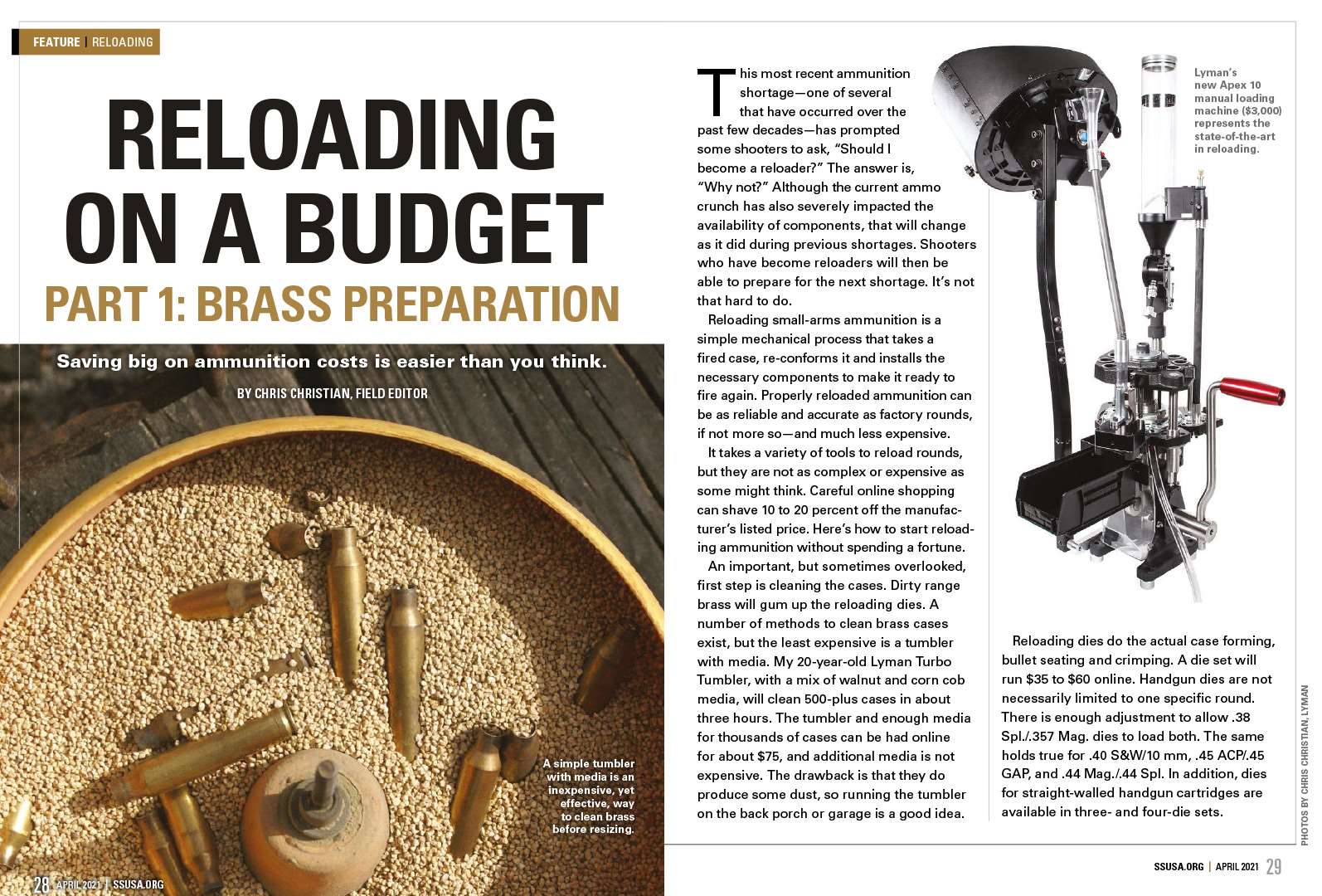 Field Editor Chris Christian says, “Saving big on ammunition costs doesn’t have to cost a lot.” This month, the first installment of his series on budget small-arms reloading discusses the advantages and disadvantages of progressives presses and single-stage presses, what to look for in a reloading die set and effective ways to clean and lubricate brass cartridge cases. Be sure to read Part 1 of “Reloading on a Budget.”