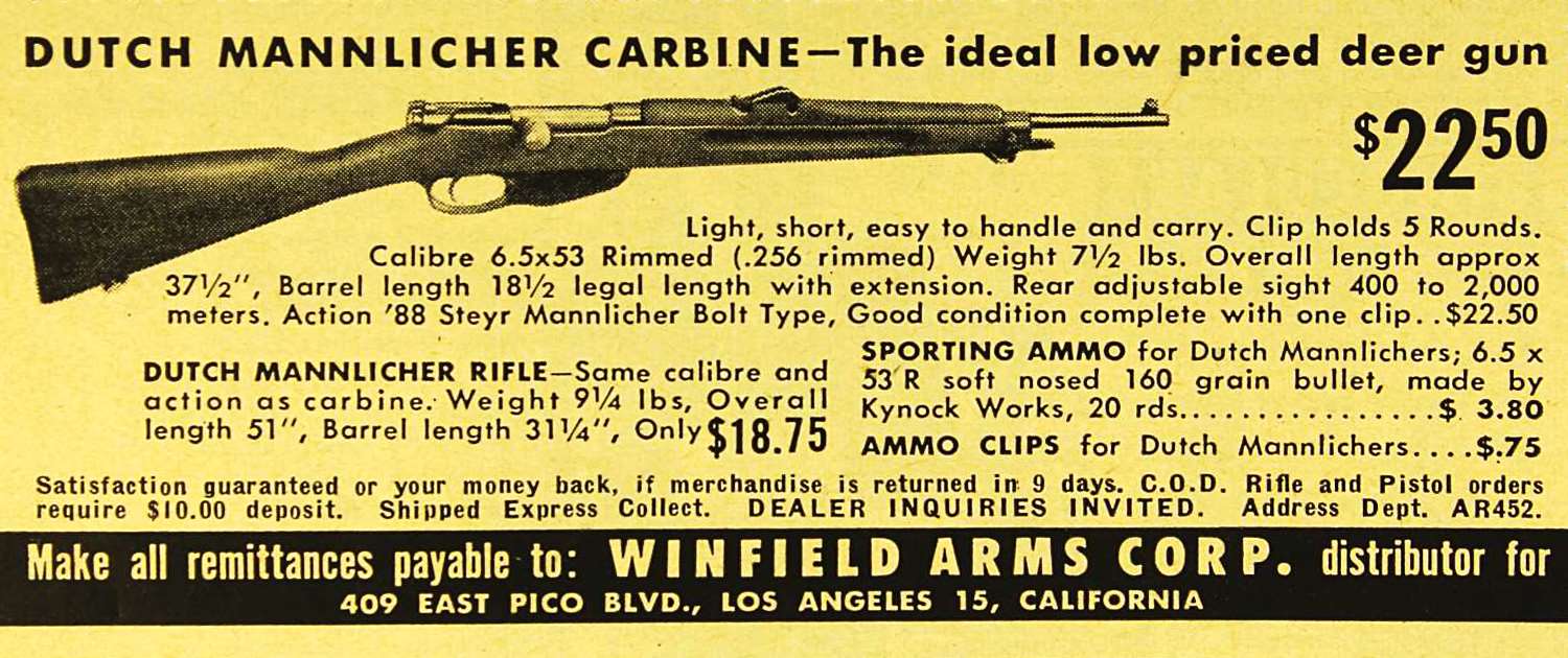 The influx of German 98k rifles following WWII prompted a steady, if not profuse, supply of American-made 8x57 Mauser ammo in hunting configuration, while the flood of Japanese 6.5 mm and 7.7 mm rifle “bring-backs” prompted little new U.S. ammo manufacture for those guns. Perusals of 1950s-era American Rifleman magazines indicate that many other post-war foreign milsurp rifles and their cartridges have been largely ignored once the supply of milsurp ammo―and en bloc clips for those requiring them―dried up.