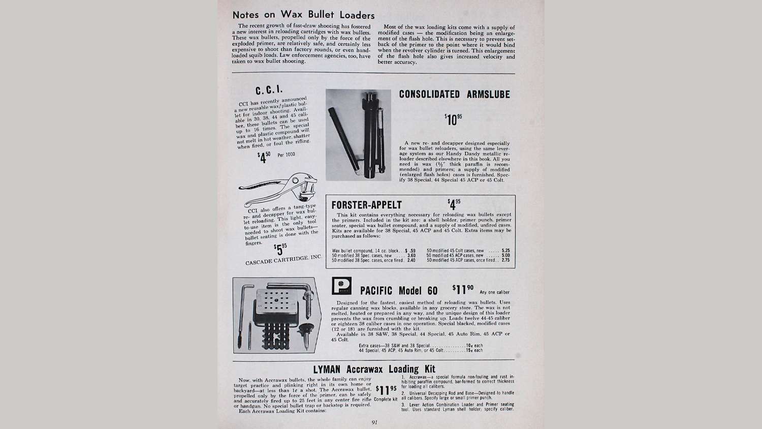 Wax bullet reloading appears in the 1962 Handloader’s Digest in the very first issue, with a full-page listing tools, “special wax compounds” and cartridge cases with pre-drilled flash holes offered by CCI, Lyman and others taking advantage of the fast draw vogue. By the Fourth Edition, the emphasis was on plastic bullets; the Eighth Edition has a single listing for a Forster wax bullet kit. By the 13th Handloader’s Digest, wax bullet reloading had gone the way of the yo-yo and poodle skirts. Such is the nature of trends.