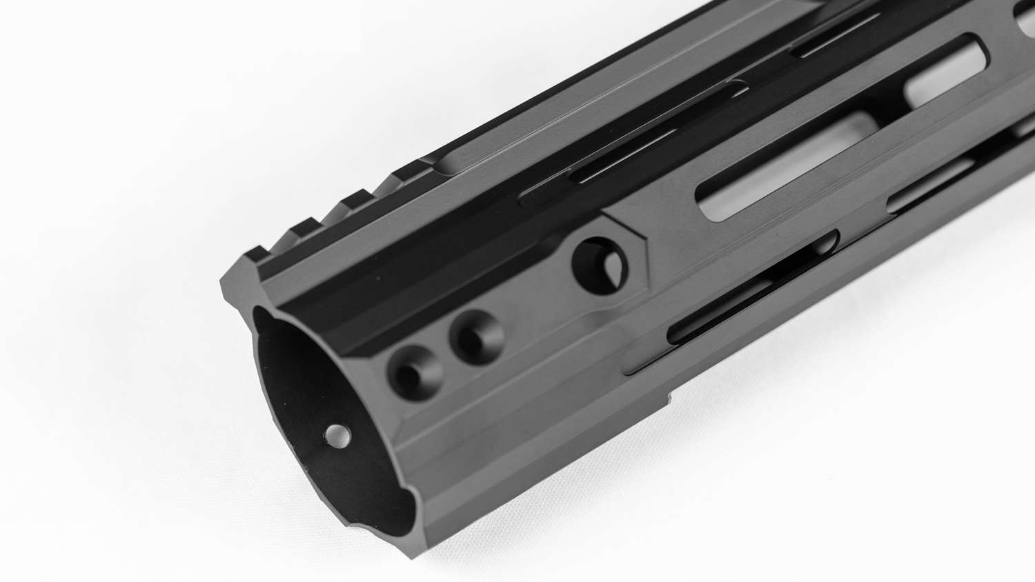 As the blunting is the only difference, both handguards are built around identical lines. Machined from 11 pounds of billet 7075 aluminum, the TEAM is guaranteed to be perfectly straight, keeping iron sights centered right over the barrel. Speaking of, top and bottom Picatinny rails sit at the muzzle for easy attachment of bi-pods, lights, or said backup iron sights, while M-Lok covers the rest at 3, 6 and 9 o’clock for endless mounting options. For your primary target-viewer, 1.5 additional inches of picatinny rail sit just forward of the receiver, in case you want to get creative when mounting that optic. QD sling mounts are inset at each end, on both sides, and we still haven’t gotten to the best part.