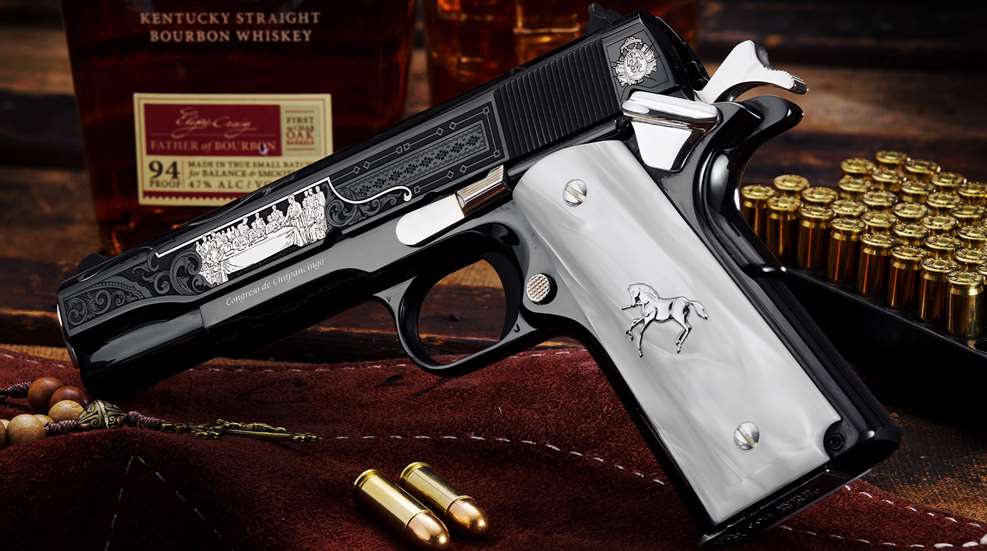 To finish off this custom gun, the frame, slide, barrel and hardware are all highly polished with .999 silver plating in select areas. This historical masterpiece is made complete with Kirinite grips presenting the silver emblem of the iconic Rampant Colt.