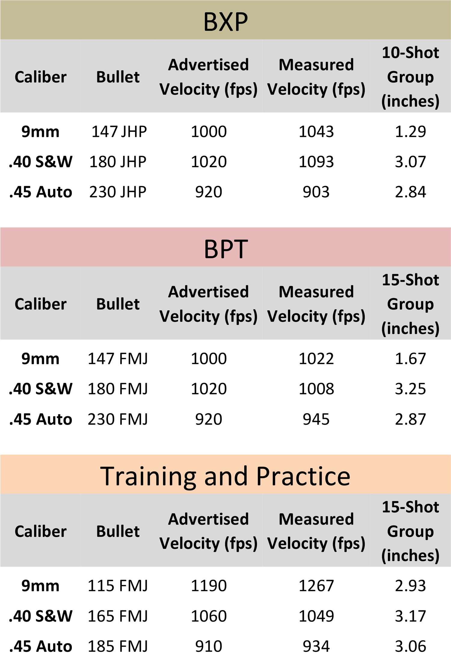 I tested 9mm, .40 S&W and .45 Auto loads for velocity and accuracy at 25 yards. The guns were fired from a Ransom Rest with 10-shot (BXP) and 15-shot groups (BPT and Training and Practice). Velocity was recorded with a Shooting Chrony chronograph at about 10 feet.