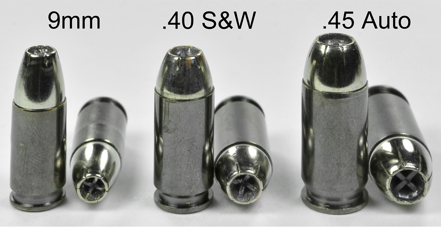 The 9mm and .45 caliber BXP bullets stopped in the fourth jug, and the .40 caliber bullet stopped in the third jug. All bullets showed extensive, albeit uneven, expansion. The 9mm bullet expanded to 177 percent of its original diameter and shed about 2 percent of its weight. The .40 bullet expanded to 197 percent of its original diameter and shed about four percent of its weight.