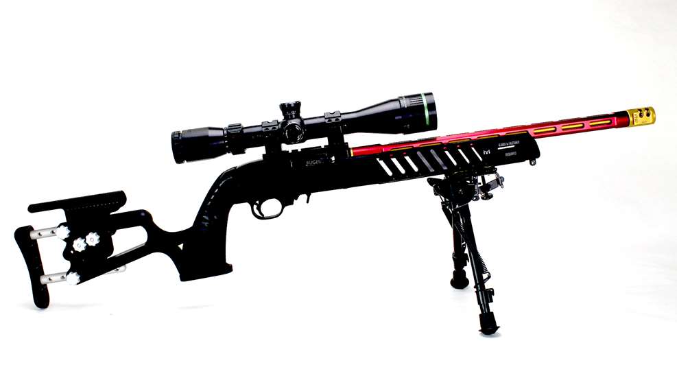 Though many shooters consider rifles chambered in .22 Long Rifle to be recoilless, the cartridge does indeed impart some recoil, more noticeably so when the rifle is deliberately lightened as the one here with the Spitfire barrel. While such recoil is of no concern to shooter comfort, it does move the sights off the target and adds precious time needed to reacquire the target when competing against the clock.
