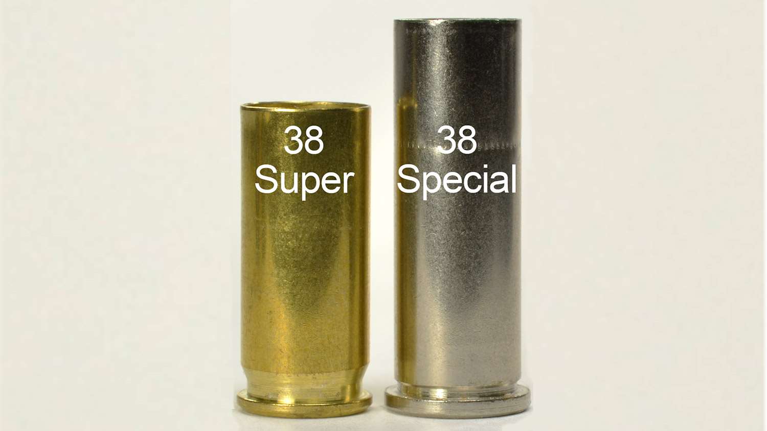 The semi-rim is small, but it’s there. Industry specifications (Sporting Arms and Ammunition Manufacturer’s Institute, SAAMI) list the rim diameter on the .38 Super as 0.406 inch compared to the case wall diameter of 0.384 inch. Most actual cases have a rim diameter of 0.400 to 0.402 inch, and a case wall of 0.380 inch. That’s a 0.020- to 0.022-inch difference, and compares to a rim diameter of about 0.060 inch on a .38 Special.